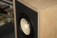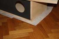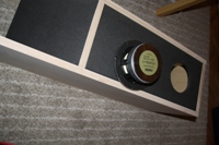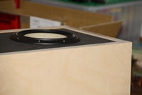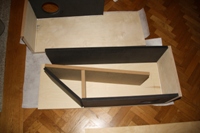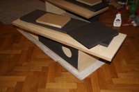 Der Aufbau: Auf Grund der recht kurzen Länge mussten wir die TML nur einmal falten. Damit die Line sich nach unten öffnen kann haben wir die Seitenwände länger gelassen. Die Box hat eine Gesamthöhe 1m und der Treiber ist auf ca. 85cm positioniert. Das Abschlußbrett im unteren Bereich des Treibers dient nur als Sichtblende. In Hörversuchen konnte kein Unterschied festgestellt werden. |