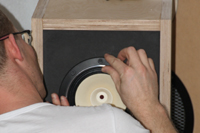 Der Magnet des Breitbänders ist fast so groß wie der Ausschnitt für den Treiber. Um mehr Luft zum arbeiten zu haben hinterfrästen wir die Schallwand im inneren Bereich |