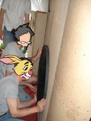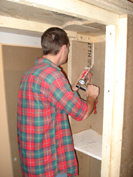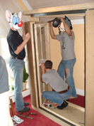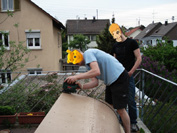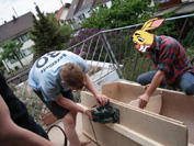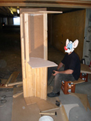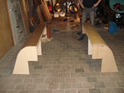 Nachdem die Seitenteile geschliffen waren, kürzten wir die Verbindung zur Rückwand. Abends haben wir die Bauteile erst ins Wohnzimmer und anschließend ins Hörzimmer gebracht. |