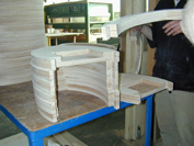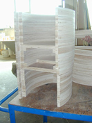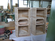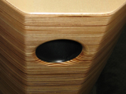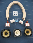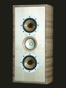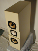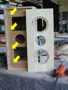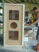 Das Konzept: Die Preso ist eine konventionelle Bassreflex. Die beiden Tieftöner sollten in getrennten Volumina spielen. Um eine möglichst homogene Schallabstrahlung zu erhalten haben wir uns für eine D´Appolito ähnliche Anordnung entschieden. Die Frequenzweiche wurde mit 6dB/Oktave für die Tieftöner und den Breitbänder gewählt. Der Aufbau der Frequenzweiche sollte symetrisch erfolgen. Der Aufbau: Bei dem Aufbau haben wir uns ein Stückweit an der Replikon gehalten. Die Gehäuse sollten mit Hufeisenförmigen Gehäuseteilen aufgebaut werden. Somit wird dann die Stirnseite des Multiplex als Gehäusewand sichtbar. |