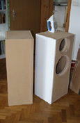 Regal-Box Die Treiber: Die Auswahl der Treiber war nach dem Umzug nicht schwer. Sicher verpackt lauerten noch die Coral 8A70 und die Fostex W300A-II auf einen erneuten Wiederverbau. Die beiden Treiber passen einfach zusammen wie kaum eine andere Paarung. Das Konzept: Die TML war leider nicht kompatibel mit der neuen Wohnzimmerplanung. Freistehende Lautsprecher passten nicht mehr ins Zimmer und so kam die Idee die Lautsprecher im Regal zu integrieren. Die ersten Designideen mussten schnell wieder verworfen werden, da ein BR oder gar ein Horn einfach zu groß werden würde. Also ein geschlossenes Volumen für den W300A-II. Mit knapp 80ltr auch nicht gerade eine klassische Regalbox. Der Coral benötigt ja gute 22ltr. Um genügend Reserven zu haben, haben wir das Volumen auf 25ltr. ausgelegt. |